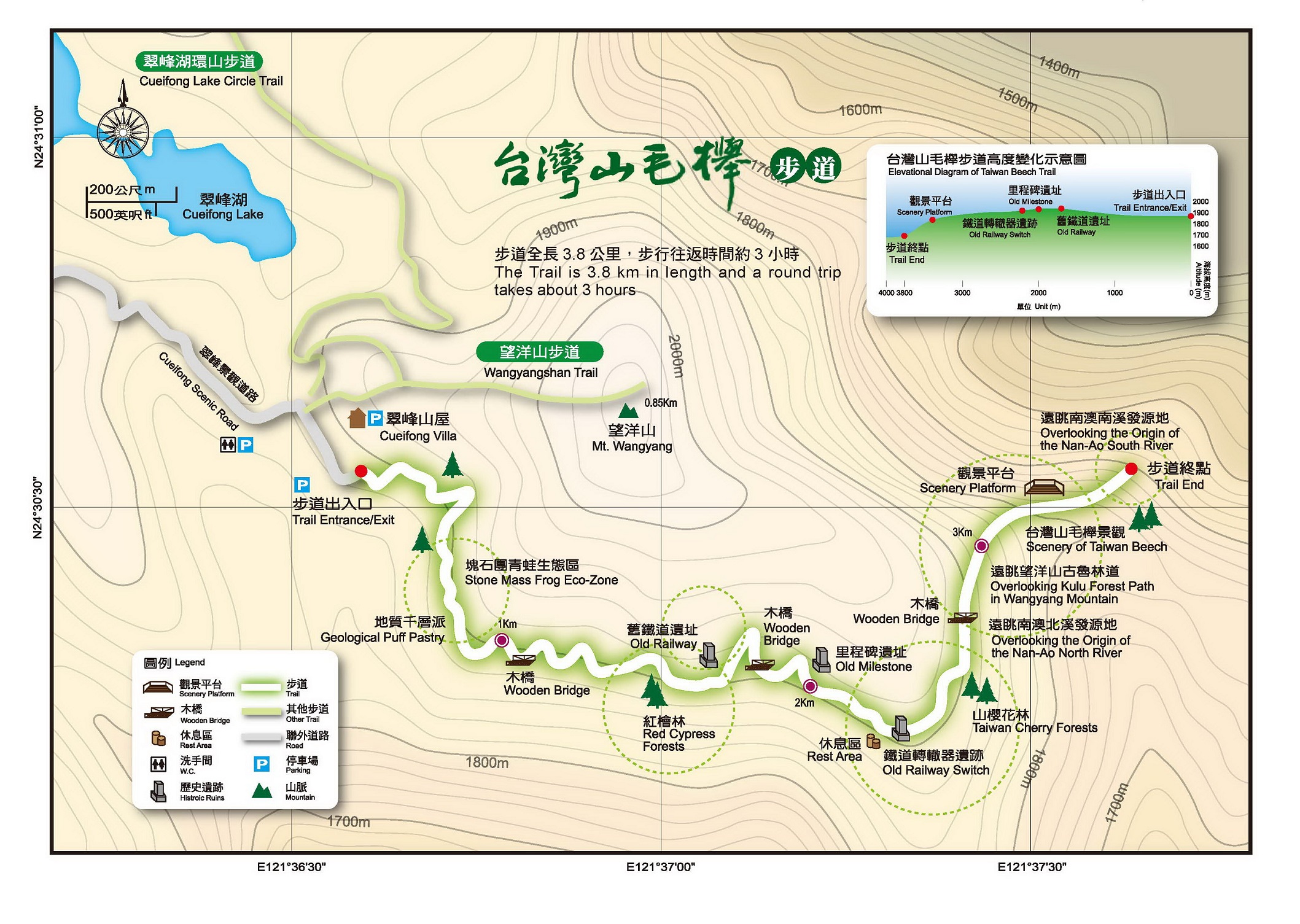 步道全長約3.8公里,來回步行時間約3小時,難易度為中量級。